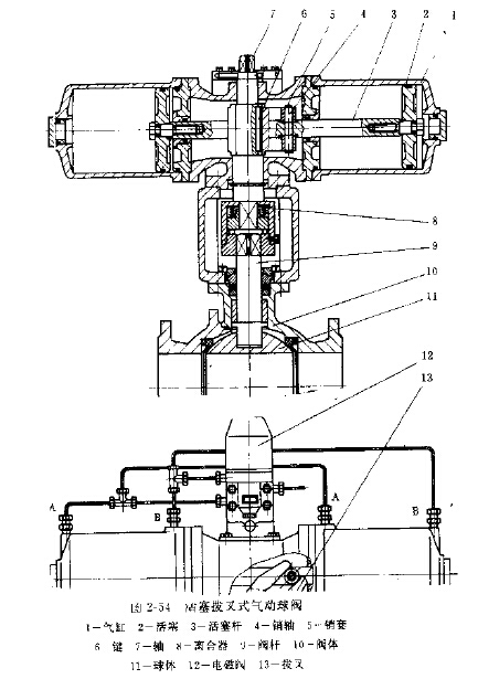 活塞撥叉式氣動球閥典型結(jié)構(gòu)如圖2-54所示,由三位四通電磁閥12控制的氣源壓力從接管A引入氣缸1,與此同時接管B排氣,活塞2在氣源壓力的推動下,通過活塞桿3、銷軸4、銷套(亦稱滑塊)5推動撥叉13。撥叉用鍵6與軸7連在一起,軸通過離合器8與閥桿9相連接,這樣活塞從左向右移動時,銷套在撥叉槽內(nèi)滑動,并推動撥叉、軸、閥桿和閥體10中的球體11一起旋轉(zhuǎn)90°,使球閥關(guān)閉(圖示位置),反之則開啟。伸出氣動裝置氣缸上方的軸端方頭供安裝扳手用,以便當(dāng)氣動裝置出現(xiàn)故障或氣源中斷時,進(jìn)行手動操作。